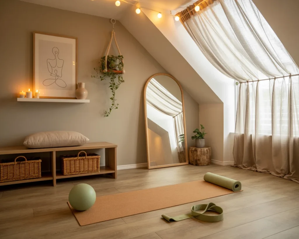 Simple props like a yoga block, strap, and bolster enhance comfort during practice. Natural elements such as plants and woven storage baskets bring balance and harmony to the room. This setup is ideal for daily yoga, gentle stretching, or quiet meditation at home.
