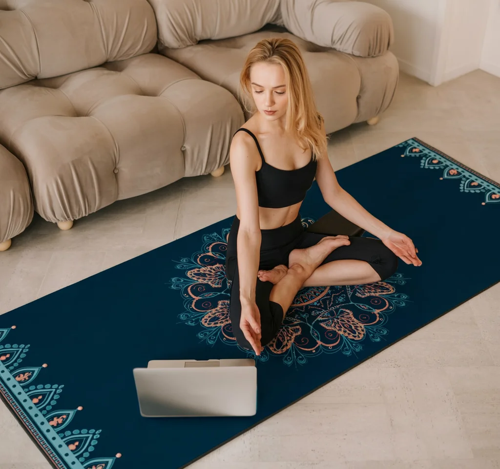 This image shows a peaceful home yoga setup designed for stretching and meditation. The cushioned yoga mat features a calming mandala pattern that adds a sense of balance and focus to the practice. Its non-slip surface provides stability during seated poses, making it suitable for both beginners and experienced practitioners.