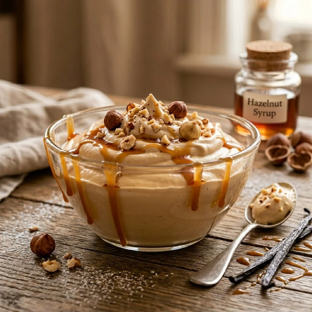 - Fold in the hazelnut syrup or paste and mix until smooth.