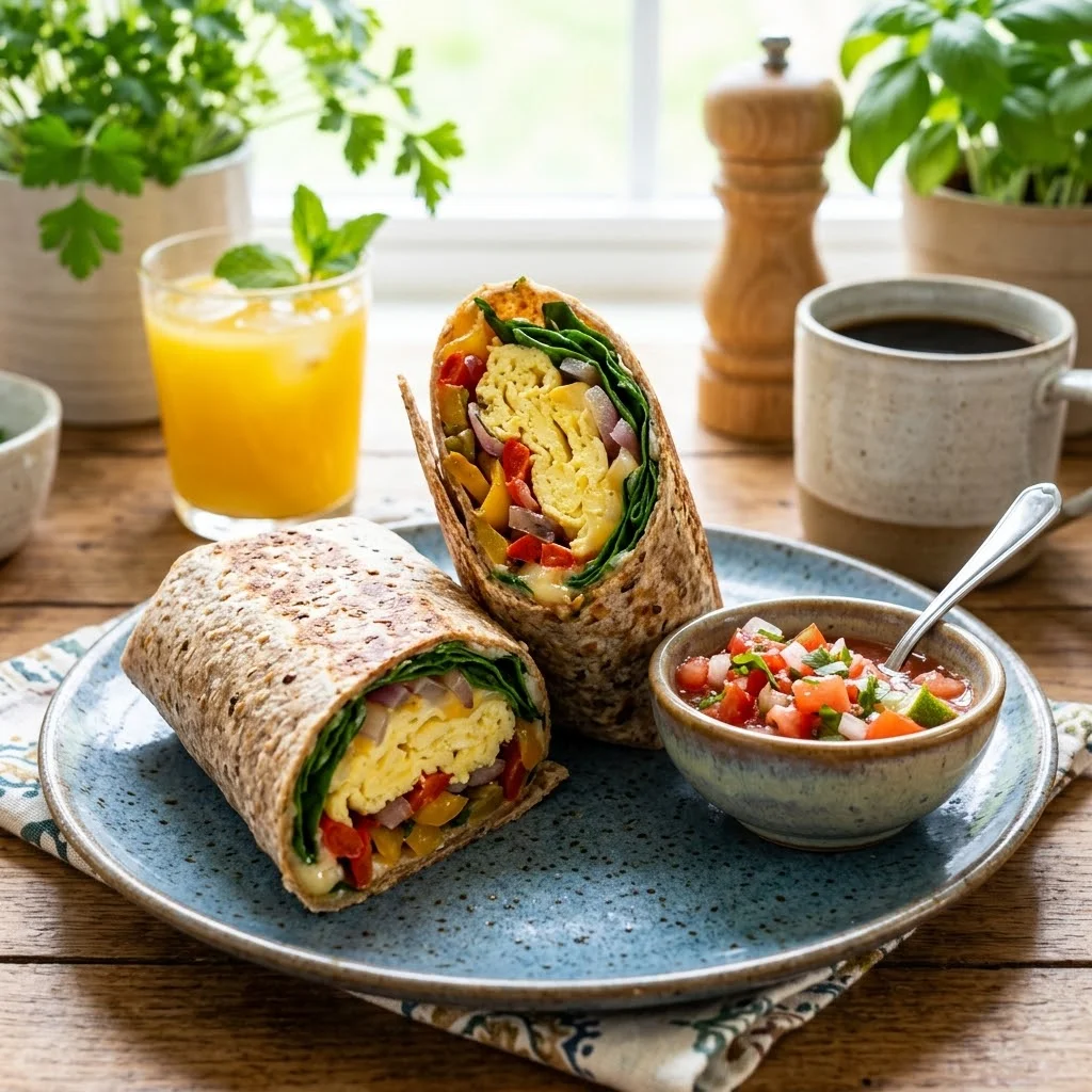 Scramble eggs with veggies, wrap in a whole wheat tortilla, add salsa for flavor.