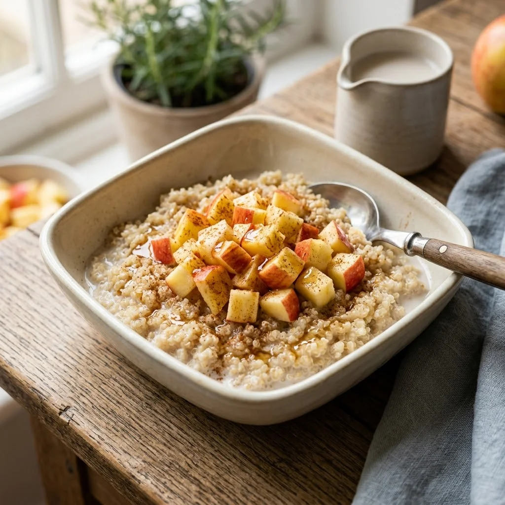 Warm cooked quinoa with almond milk, stir in diced apple and cinnamon, drizzle with honey.