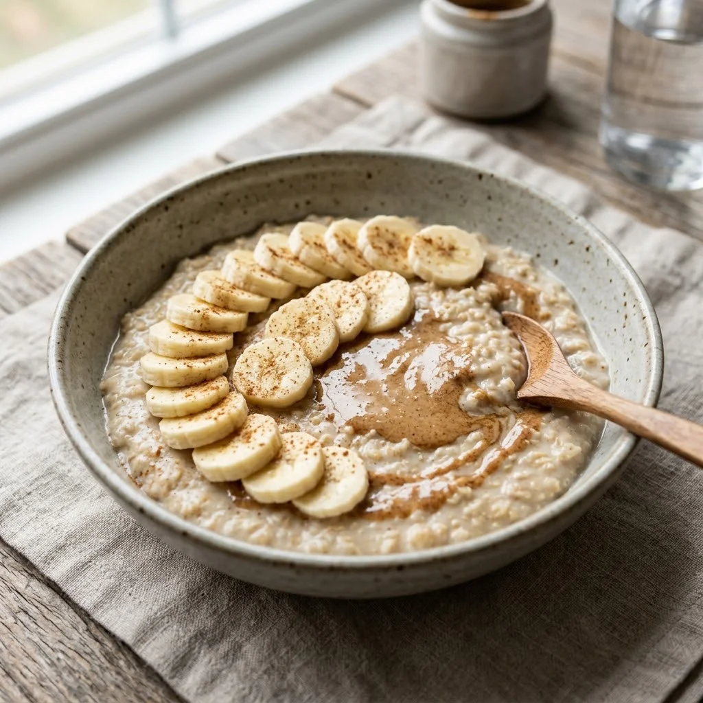 Cook oats with water or almond milk until creamy. Top with banana slices, almond butter, and a sprinkle of cinnamon.