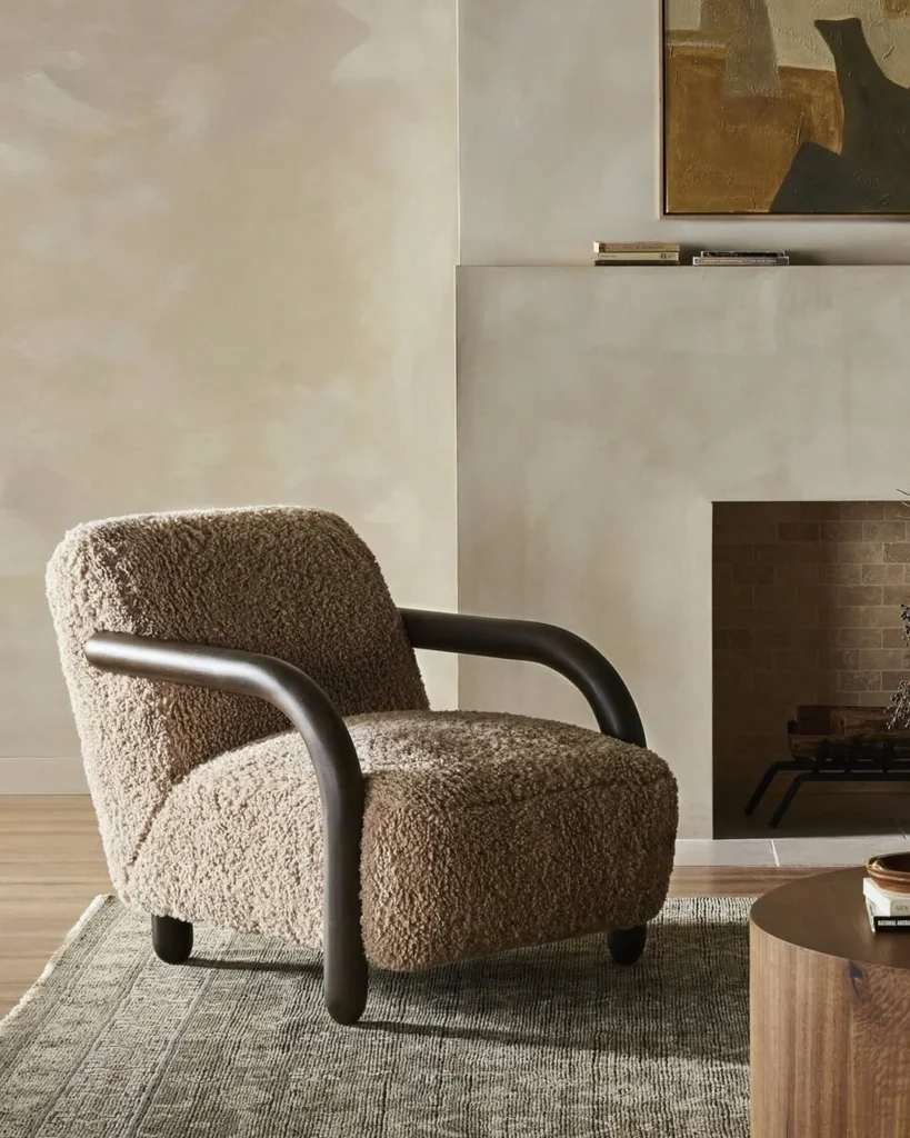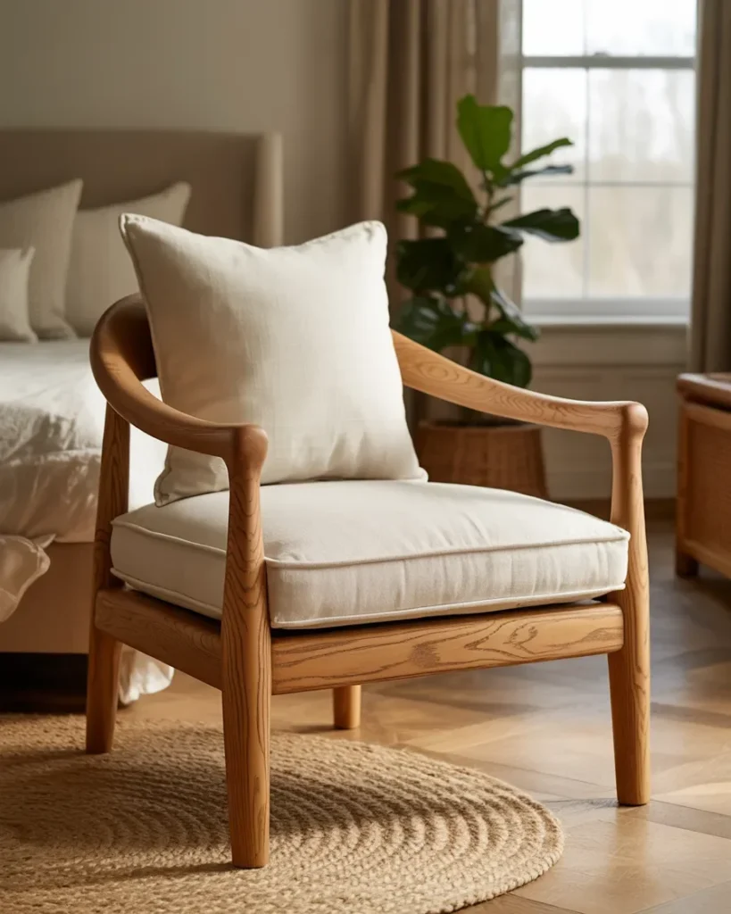 Within accent chairs for bedroom ideas, this style stands out for its blend of comfort and craftsmanship. The mix of plush seating and wood details supports a bedroom atmosphere that feels relaxed, intentional, and well styled.