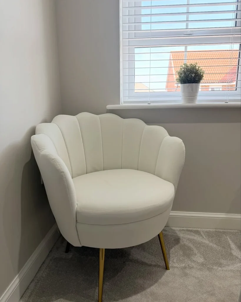Among accent chairs for bedroom ideas, this design stands out for its sculptural form and soft finish. The mix of smooth fabric and metallic accents helps create a bedroom atmosphere that feels polished, relaxed, and thoughtfully styled.