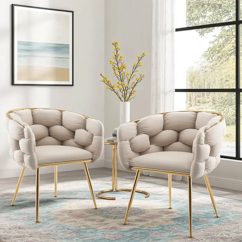 Golden metal legs add a refined contrast, catching natural light and bringing subtle shine to the setup. Neutral tones keep the look balanced, allowing these chairs to blend smoothly with modern bedrooms, airy palettes, and layered rugs.