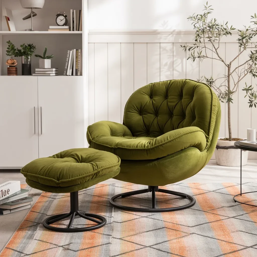 A matching ottoman adds extra comfort while keeping the overall look clean and balanced, allowing the chair to feel both functional and visually relaxed. Black swivel legs ground the design and bring a subtle modern edge without stealing attention from the soft fabric.