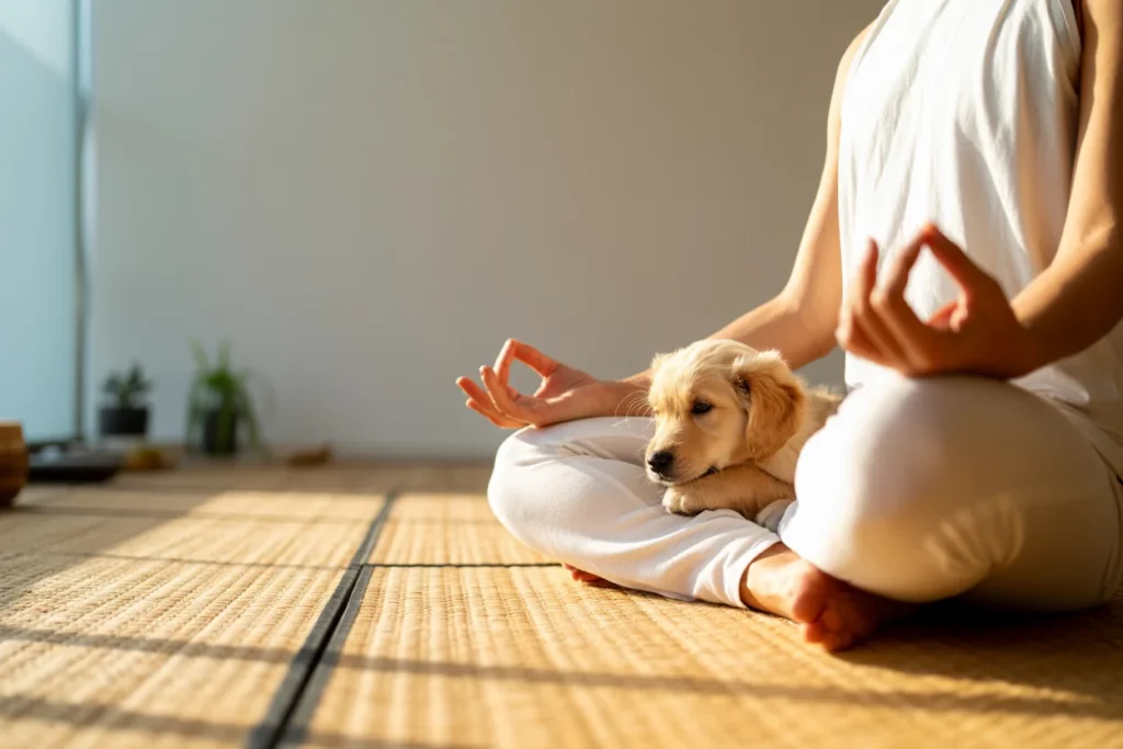 Warm sunlight fills the floor and adds a cozy glow, helping both bodies relax in a shared sense of ease. Each breath flows slowly as her hands form a simple mudra, guiding her mind toward stillness while the puppy leans into her presence.