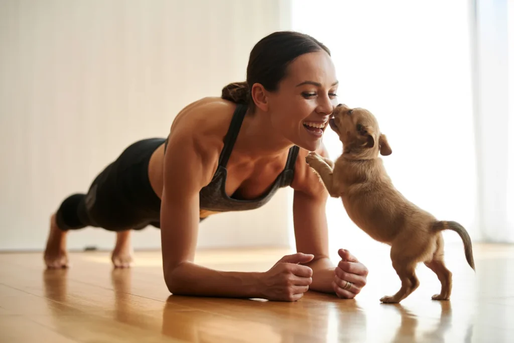 This sweet moment captures the joy behind 15 Puppy Yoga Pose Inspiration for Relaxing & Mindful Sessions. A playful puppy leans in for a tiny kiss while the woman holds a steady plank, turning a simple strength pose into a warm, grounding experience.