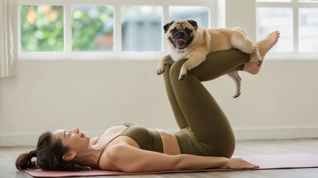 This joyful moment adds a fun twist to 15 Puppy Yoga Pose Inspiration for Relaxing & Mindful Sessions. A woman lies on her mat, lifting her legs into a gentle balance while a playful pug rests across her shins.
