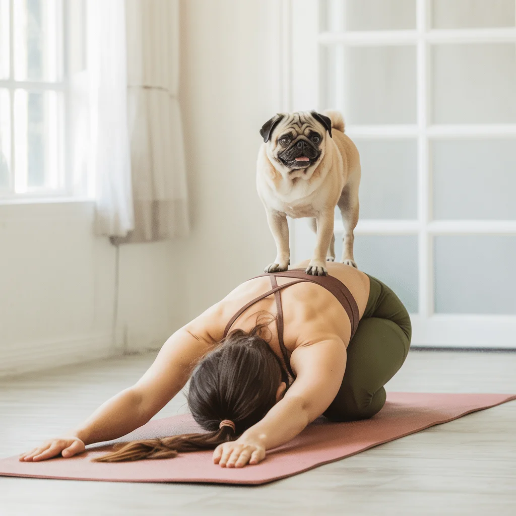 This playful moment brings warmth to 15 Puppy Yoga Pose Inspiration for Relaxing & Mindful Sessions. A woman settles into a calming Child’s Pose while a cheerful pug stands proudly on her back, turning the stretch into a lighthearted bonding experience.