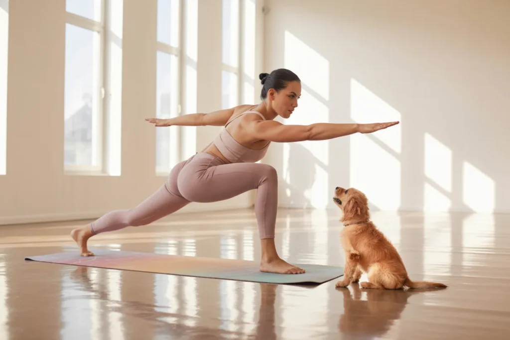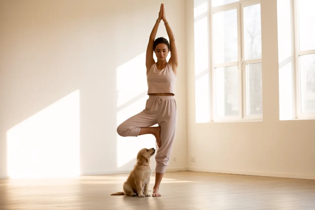 Warm morning light fills the room, creating a peaceful flow. A tiny golden puppy sits close by, watching her with a look of pure trust. Their quiet connection adds warmth to the posture, reminding anyone practicing that yoga becomes even sweeter with a companion nearby.