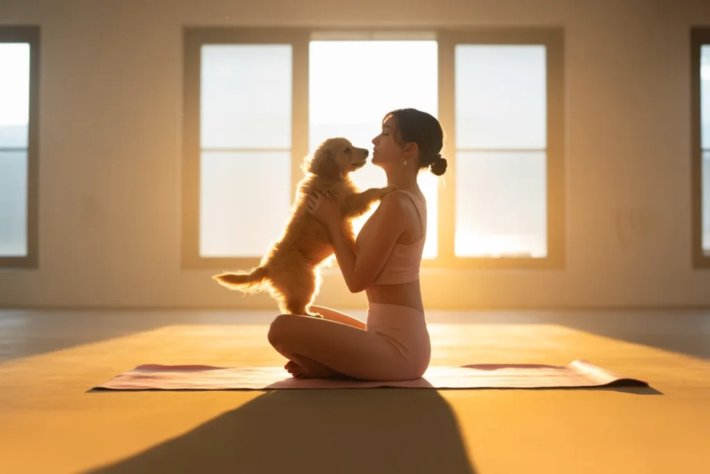 Sunlight fills the room and adds a peaceful glow, making the space feel calm and grounding. Each breath feels slower as she leans forward with care, letting her body release tension while keeping the puppy close.