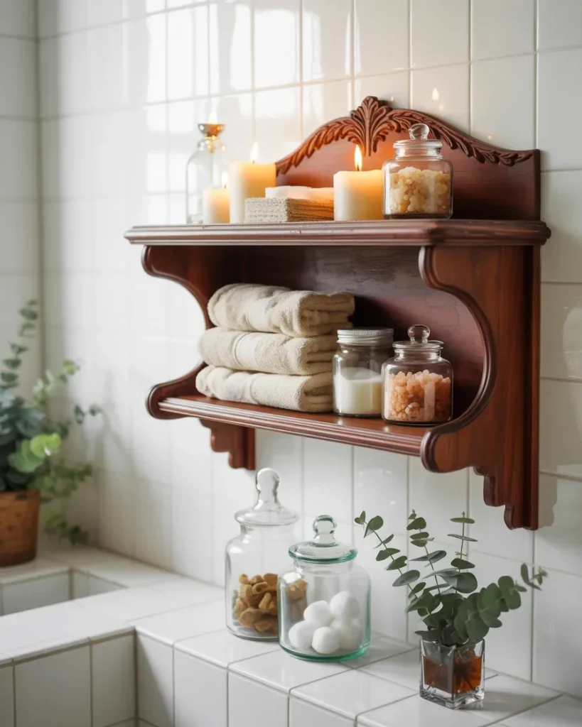 Warm wooden tones and gentle carved details give this antique wall shelf a calm and welcoming presence. Placed against glossy white tiles, the shelf adds vintage charm while creating a soft contrast with the clean bathroom setting.