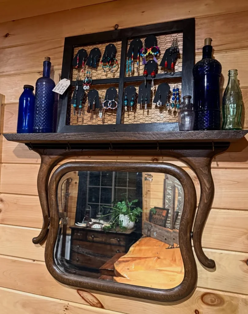 Above the shelf, colorful jewelry pieces displayed on a framed wire panel create a lively and personal touch. Decorative glass bottles resting on the shelf introduce texture and subtle color that enhances the vintage character.