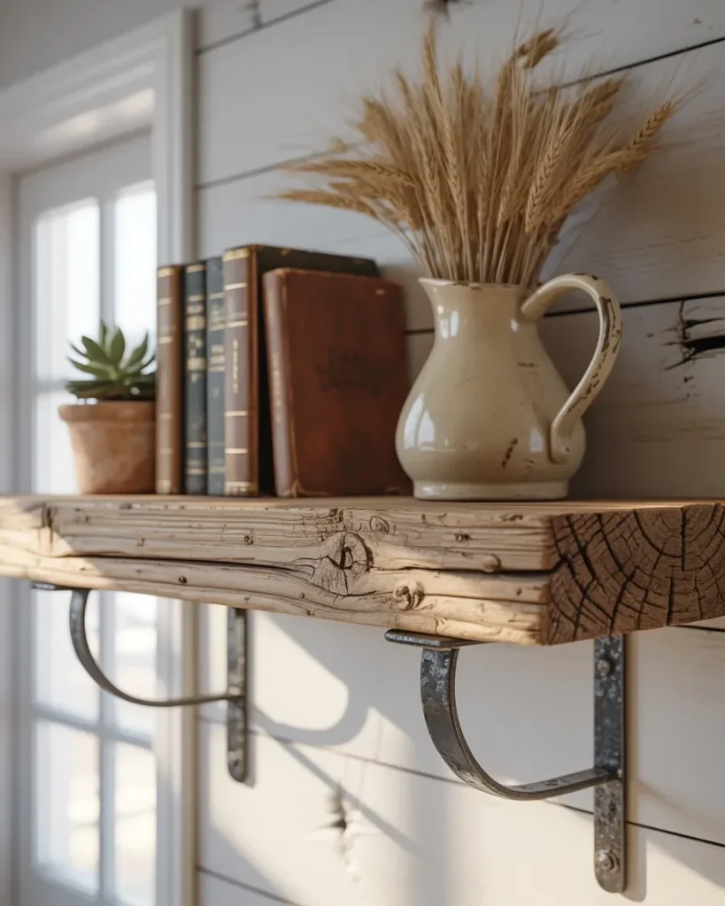 Carefully placed books, a ceramic pitcher filled with dried wheat, and a small potted plant create a calm and balanced display. Each decorative piece adds personality while the sturdy iron brackets give the shelf strength and character.