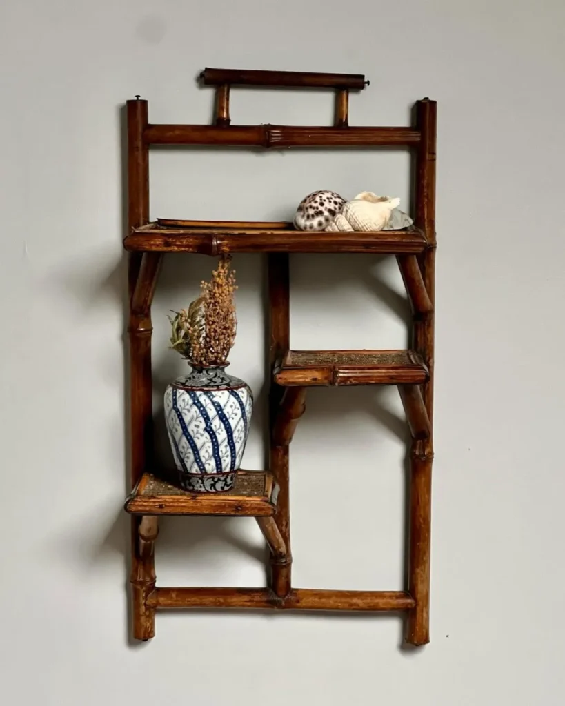 Natural bamboo lines give this antique wall shelf a warm and organic appearance. Smooth wooden poles form a gentle structure that reflects traditional craftsmanship and simple decorative charm.