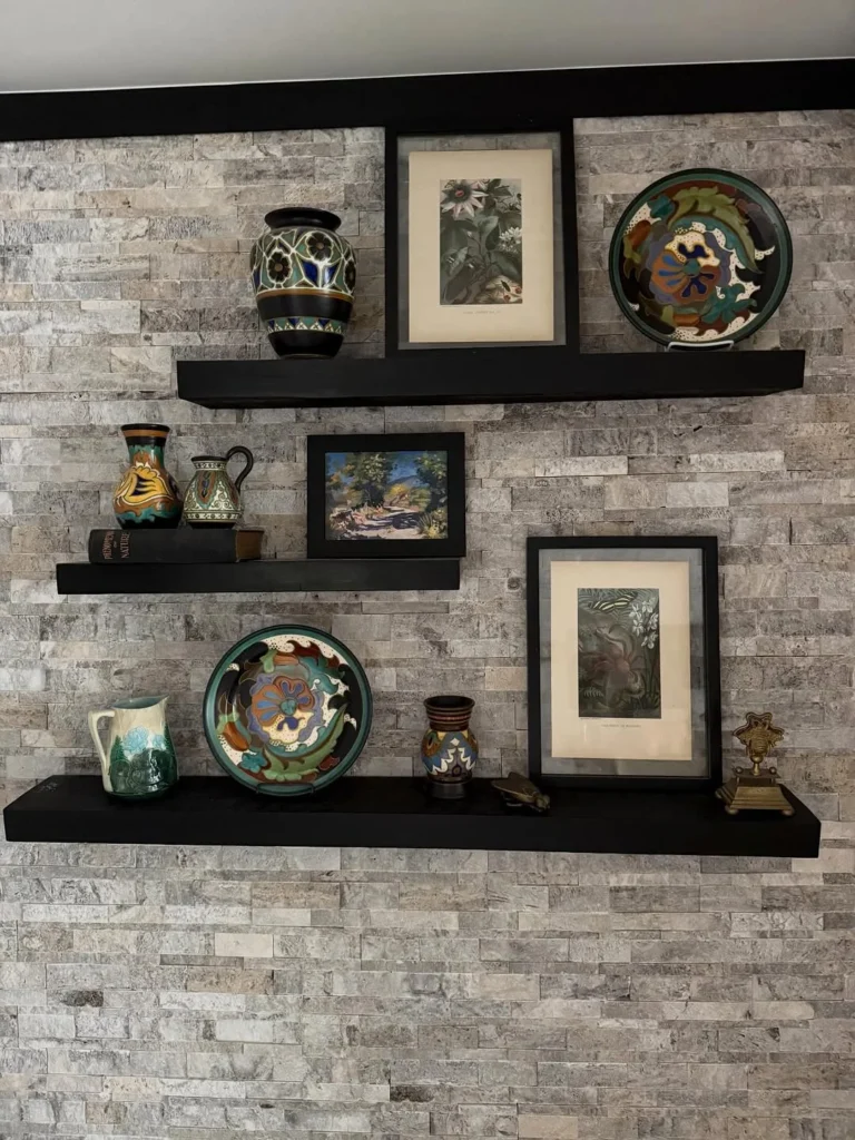 Dark floating shelves bring a refined contrast against the textured stone wall, creating a striking display area. Their clean structure allows antique décor pieces to stand out while maintaining a calm and organized appearance.