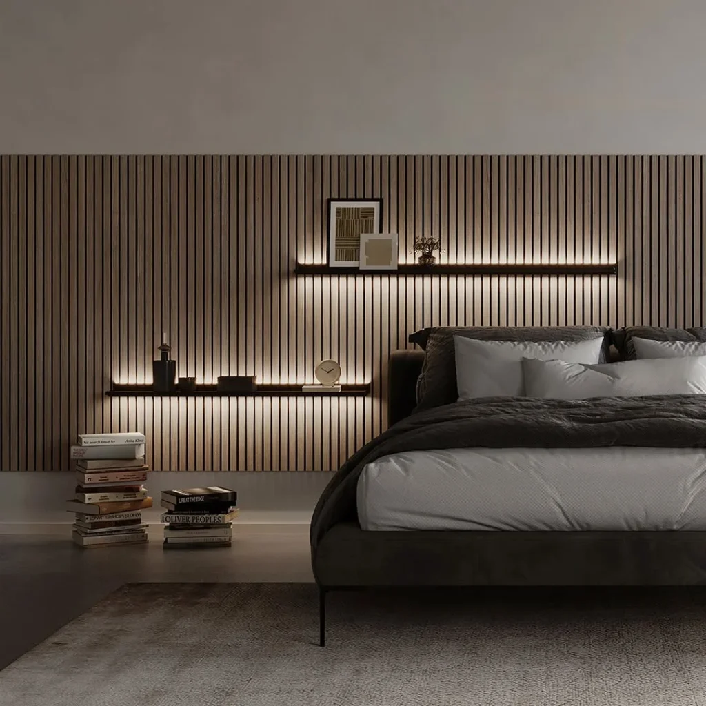 Dark bedding and minimal decor balance the brightness, allowing the lighting design to remain the focal point. Soft shadows between each slat enhance dimension and give the room a cozy yet contemporary character.