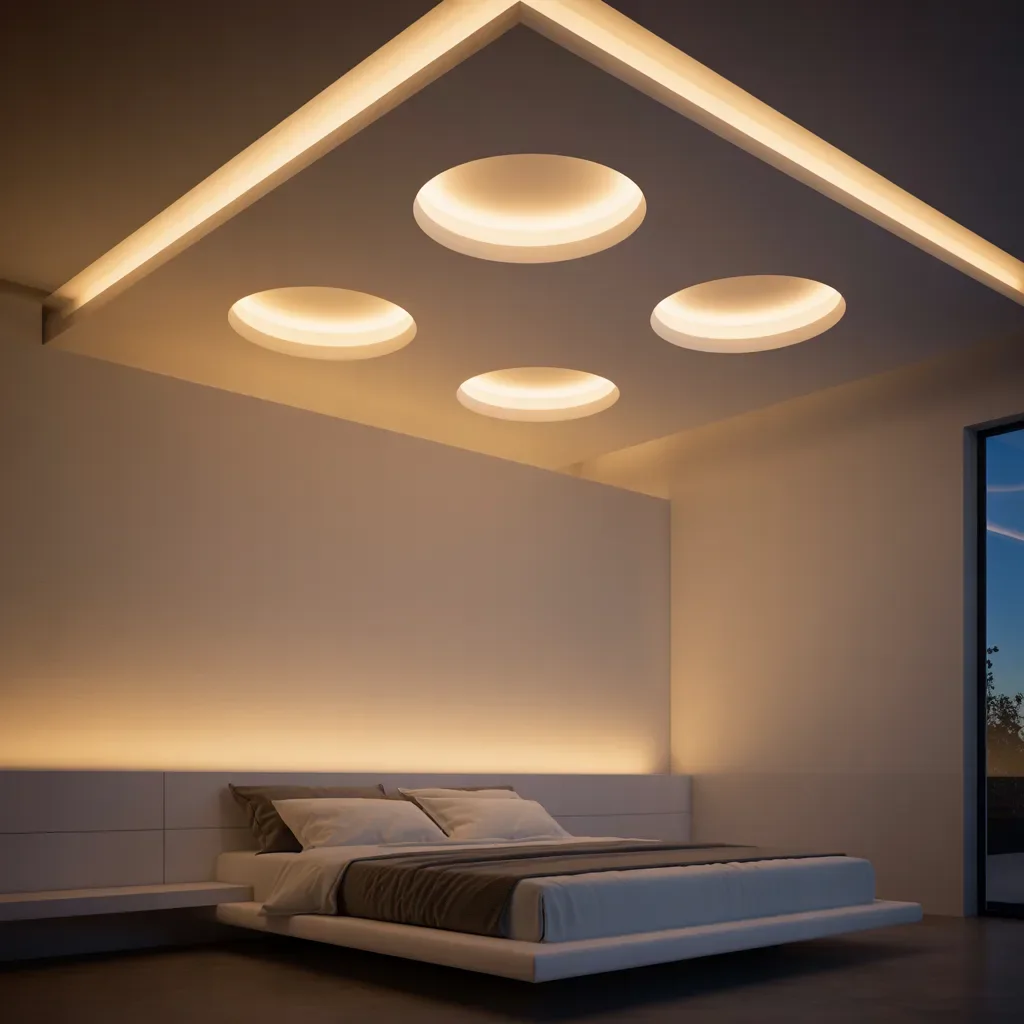 Clean recessed panels and circular ceiling lights turn this space into one of the most striking bedroom lighting ideas. Soft lines of hidden LED strips trace the ceiling edges, giving the room a floating and architectural feel.