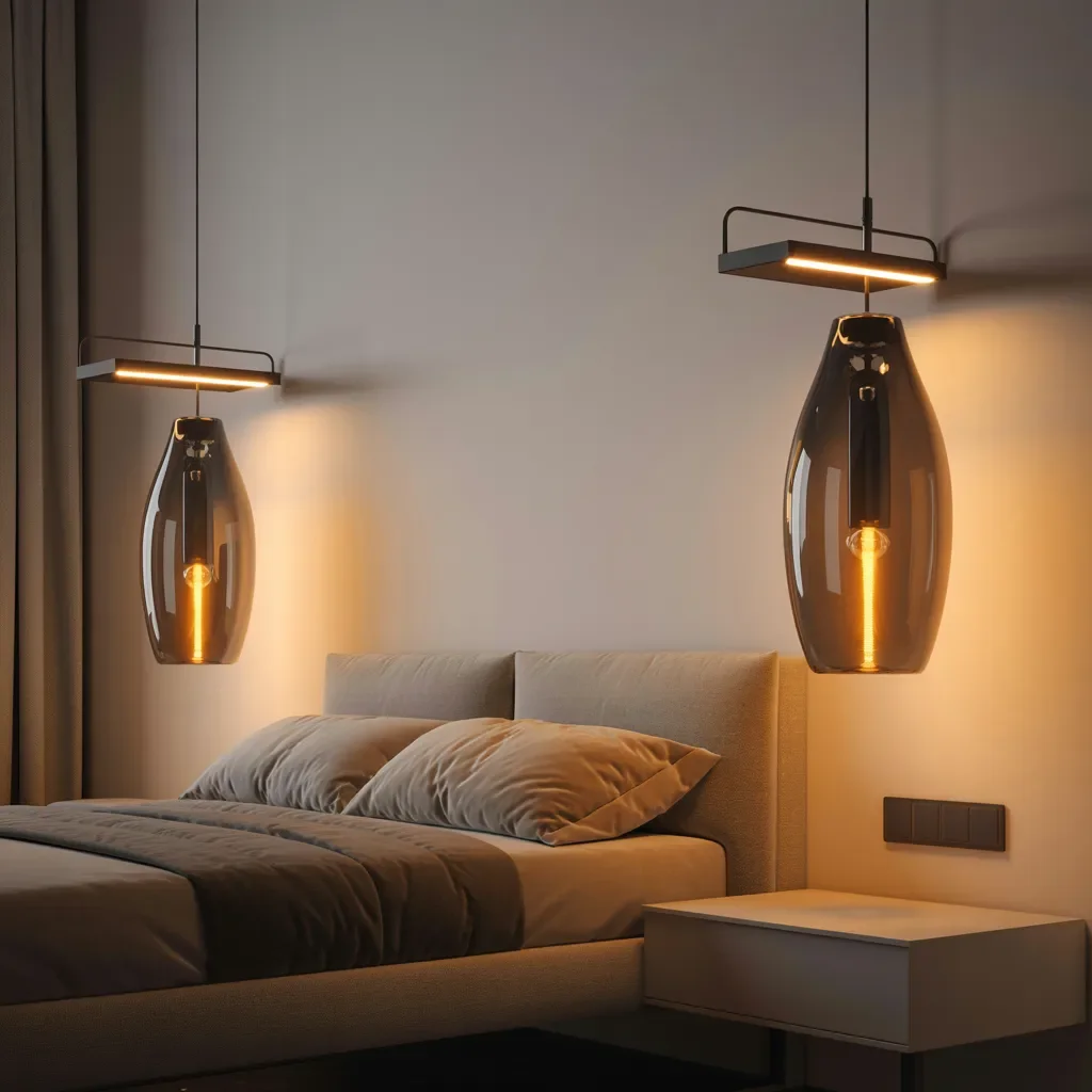 Sleek glass pendant lights hang gracefully on each side of the bed, creating a bold yet calming focal point. Warm filament bulbs glow through tinted glass, casting a soft amber light that adds depth to this bedroom lighting idea.