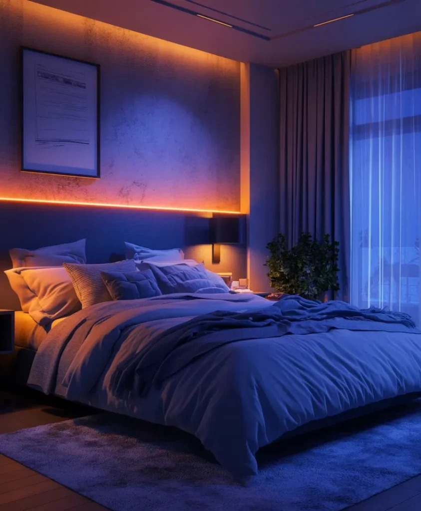 Hidden LED strips along the ceiling and behind the headboard create a layered glow that defines this bedroom lighting idea with depth and calm. Soft amber tones blend with cool evening light from the window, shaping a balanced atmosphere that feels both cozy and modern.