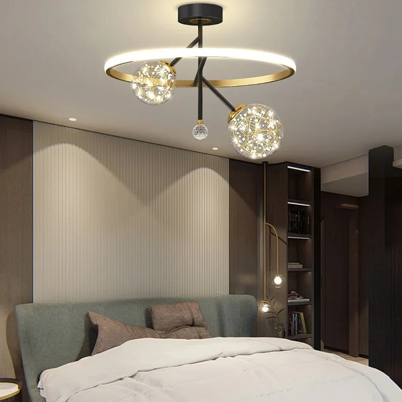 A sculptural ring chandelier instantly transforms this space into one of the most eye catching bedroom lighting ideas. Floating above the bed, the circular frame casts an even glow while the glass globes sparkle with warm light.