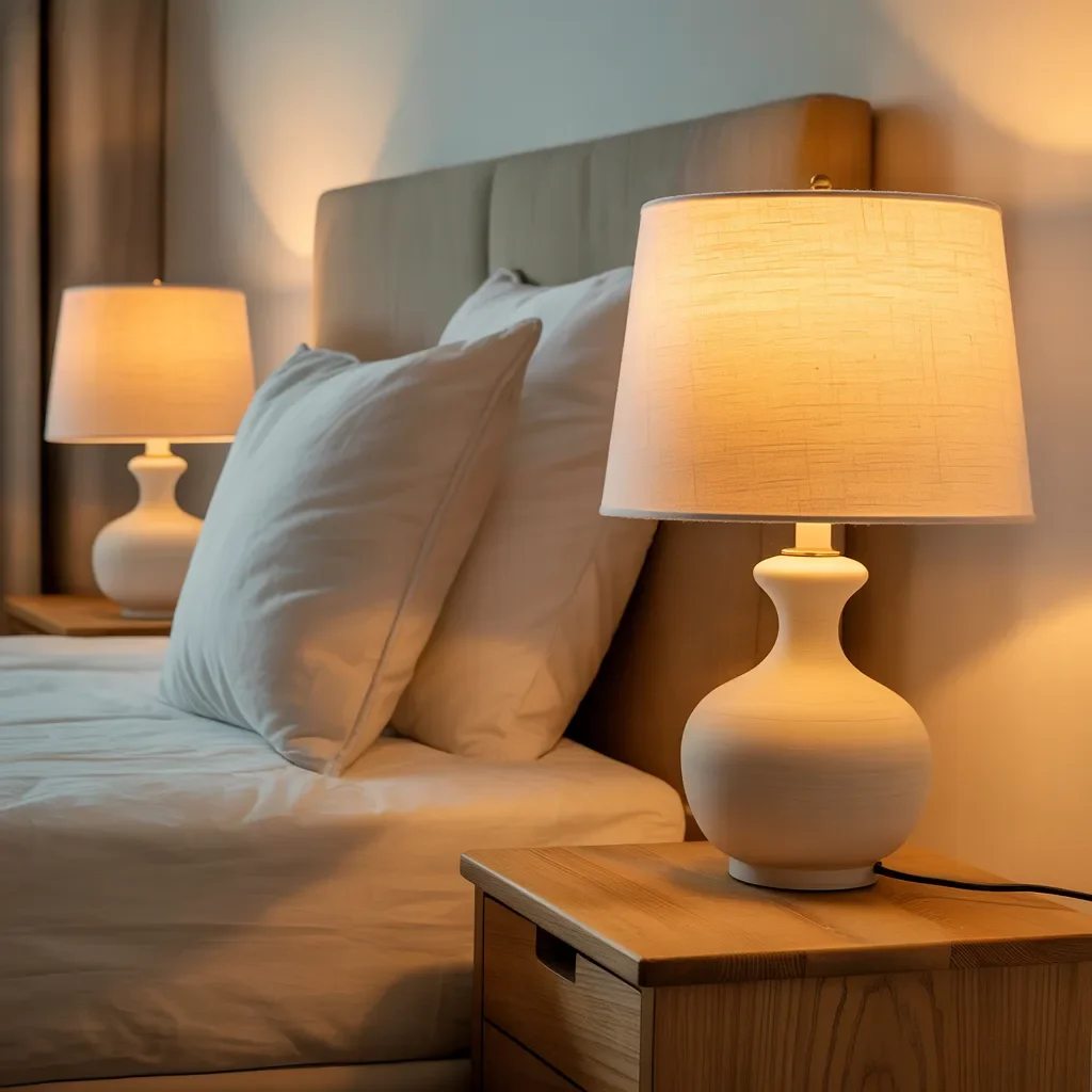 Soft ceramic table lamps on wooden nightstands create a calm and welcoming mood in this bedroom lighting idea. Warm light filters through textured fabric shades, wrapping the bed in a gentle glow that feels restful and inviting.