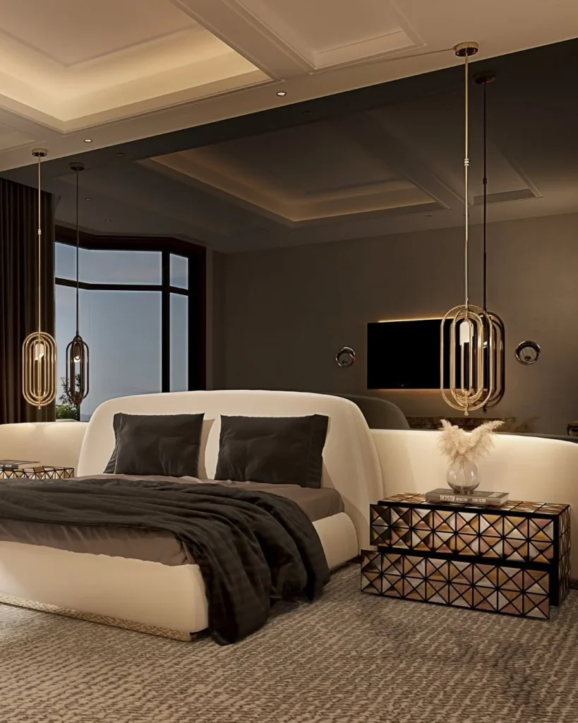 On each side, geometric bedside tables reflect the glow and introduce texture through patterned surfaces. Warm metallic finishes pair beautifully with neutral tones, making the bedroom feel cozy yet sophisticated.