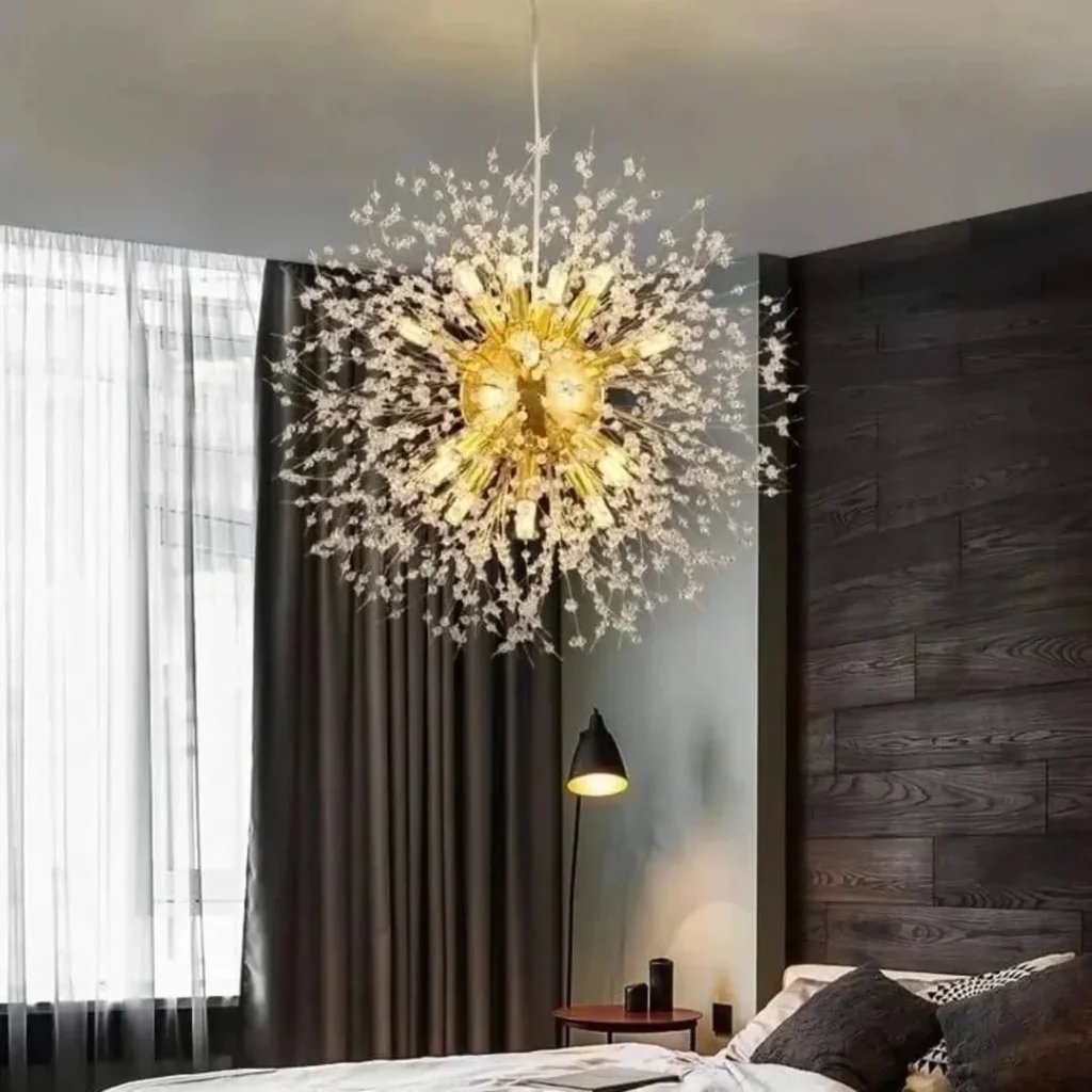 A dramatic crystal chandelier instantly transforms this space into one of the most striking bedroom lighting ideas. Golden light bursts outward like a star, creating sparkle across the ceiling and adding depth to the dark accent wall.