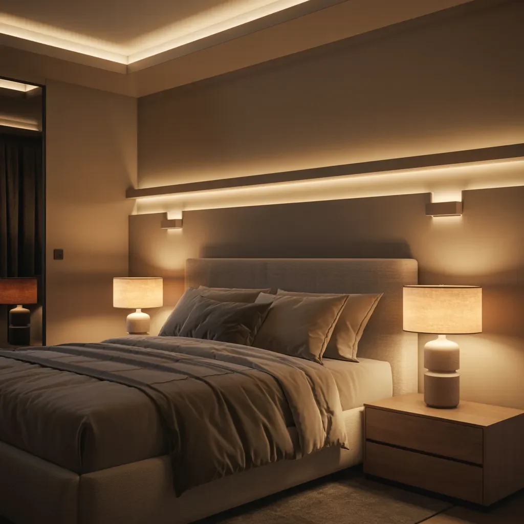 Soft cove lighting traces the ceiling lines, adding depth and elegance to this modern bedroom lighting design. Warm LED strips outline the architecture, creating a gentle frame that makes the entire space feel calm and refined.