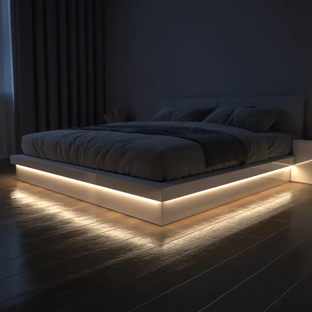 Against the dark walls and flowing curtains, the glowing base gives the illusion that the bed is suspended slightly above the ground. Balanced contrast between shadow and light enhances the clean platform structure and draws attention to the room’s modern lines.