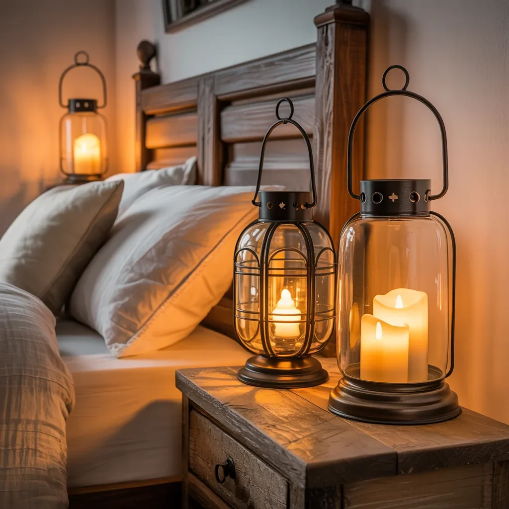 Soft lantern lighting brings a warm and intimate touch to this cozy bedroom setting. Placed on a wooden nightstand, the glass and metal lanterns hold flickering candles that cast a gentle amber glow across the bed.