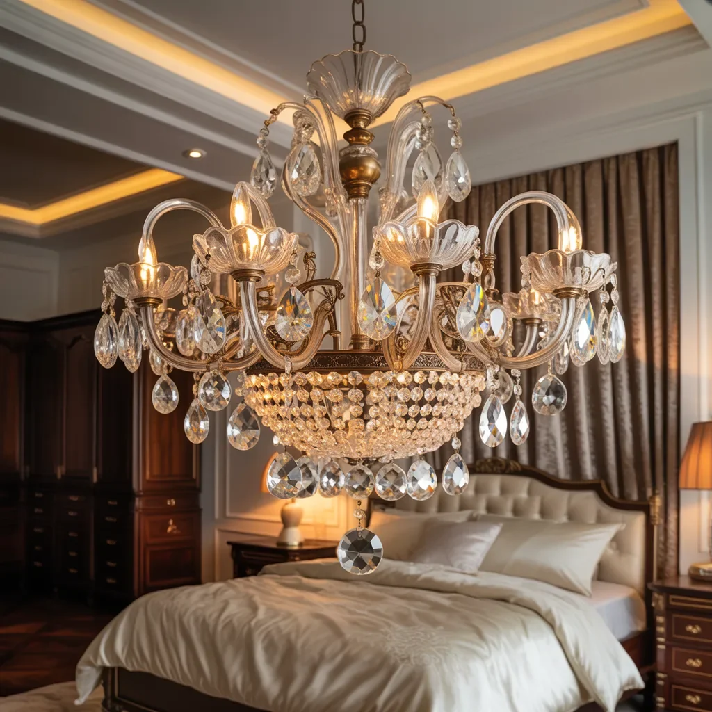 Beneath the chandelier, the bed becomes the visual anchor of the space, framed by elegance and traditional charm. Every crystal drop catches subtle highlights, producing delicate sparkles that enhance the atmosphere without overwhelming the room.