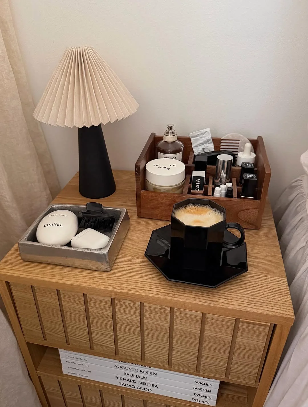 This bedside table beautifully combines style and practicality. A minimalist, pleated lamp brings an elegant yet soft glow, ideal for winding down.