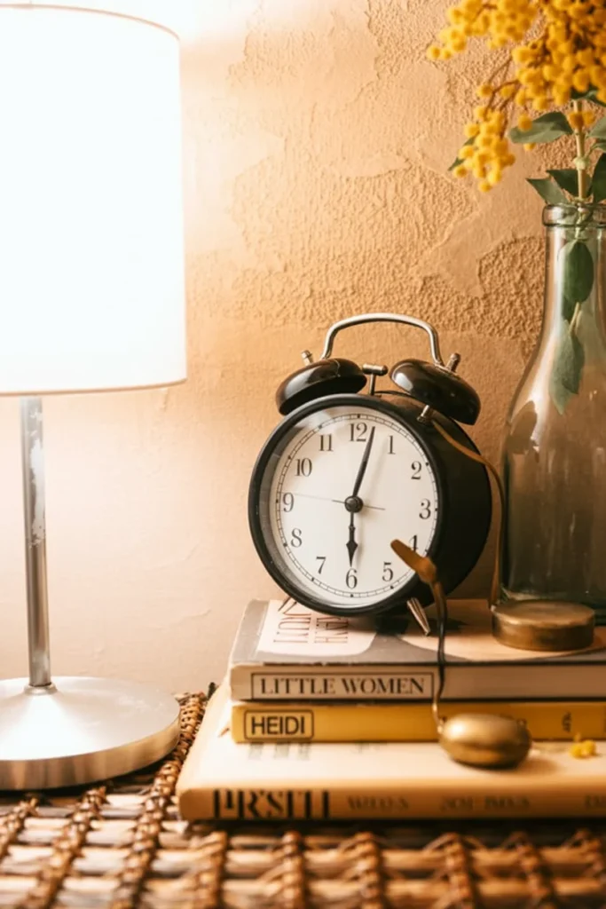 This bedside table blends vintage style with modern touches. The classic black alarm clock adds a nostalgic element, reminding you of timeless mornings, while the soft light from the lamp creates a cozy, inviting atmosphere.