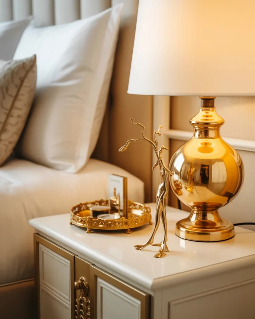The modern, minimalistic design of the table balances the boldness of the gold accents, creating an elegant space that feels refined yet cozy. This arrangement is a simple yet effective way to elevate any bedroom decor.