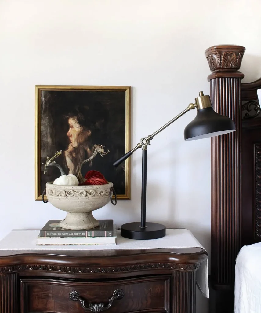 A delicate figurine and an old book bring personality and a sense of history, contributing to the room’s vintage appeal.