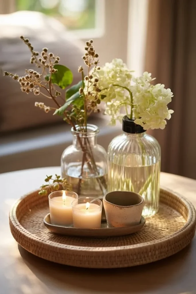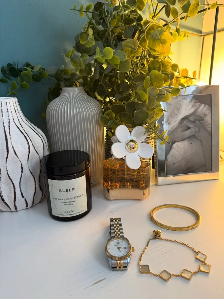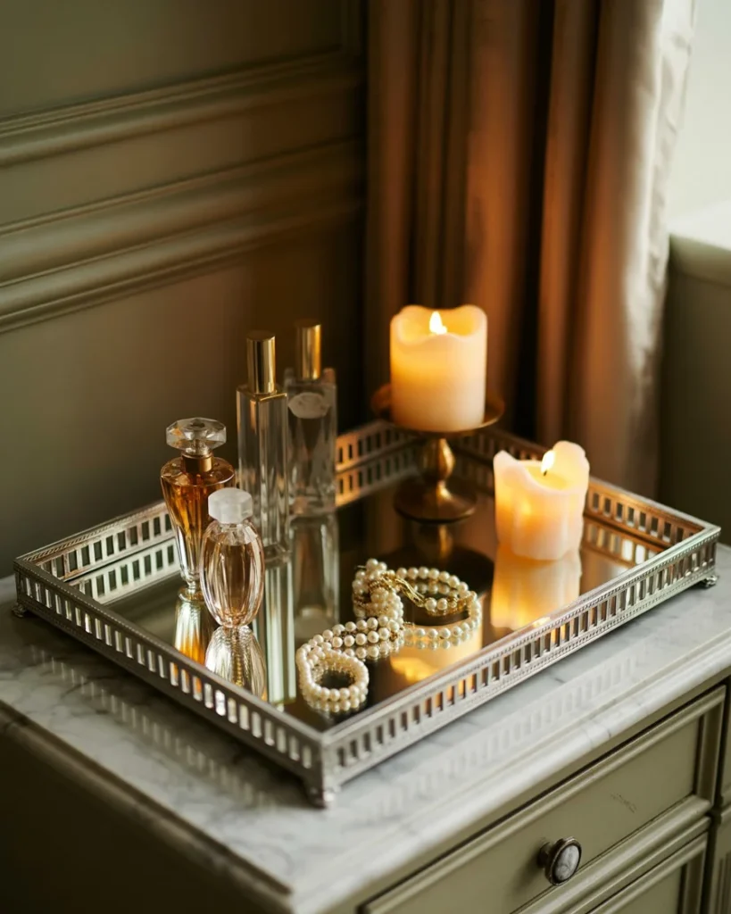 A well-organized tray holds essential items like skincare products, perfumes, and grooming tools. The tray keeps everything accessible while adding a chic touch to the arrangement.