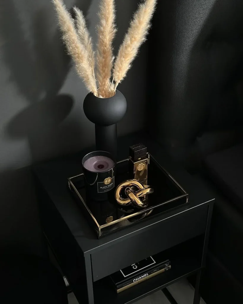 A sleek black and gold aesthetic defines this elegant bedside table arrangement. The soft, fluffy pampas grass in a matte black vase adds a touch of nature, offering contrast to the luxurious decor.