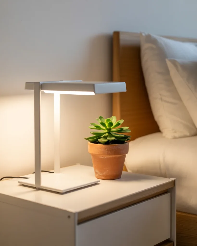 Next to it, a potted succulent adds a refreshing pop of greenery, bringing a touch of nature to the space. The terracotta pot complements the light wood tones of the bedside table, creating a balanced and tranquil atmosphere.