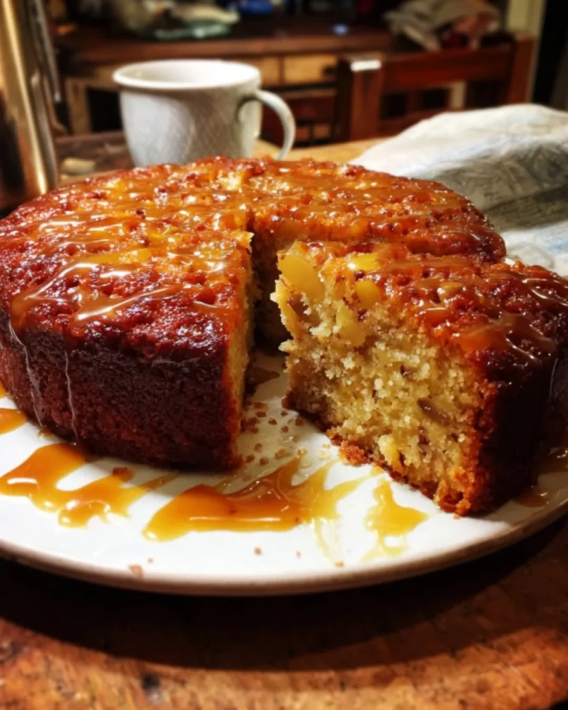 - Allow the cake to cool for 10 minutes before inverting onto a serving platter. Drizzle the warm caramel sauce over the cake, allowing it to cascade down the sides.