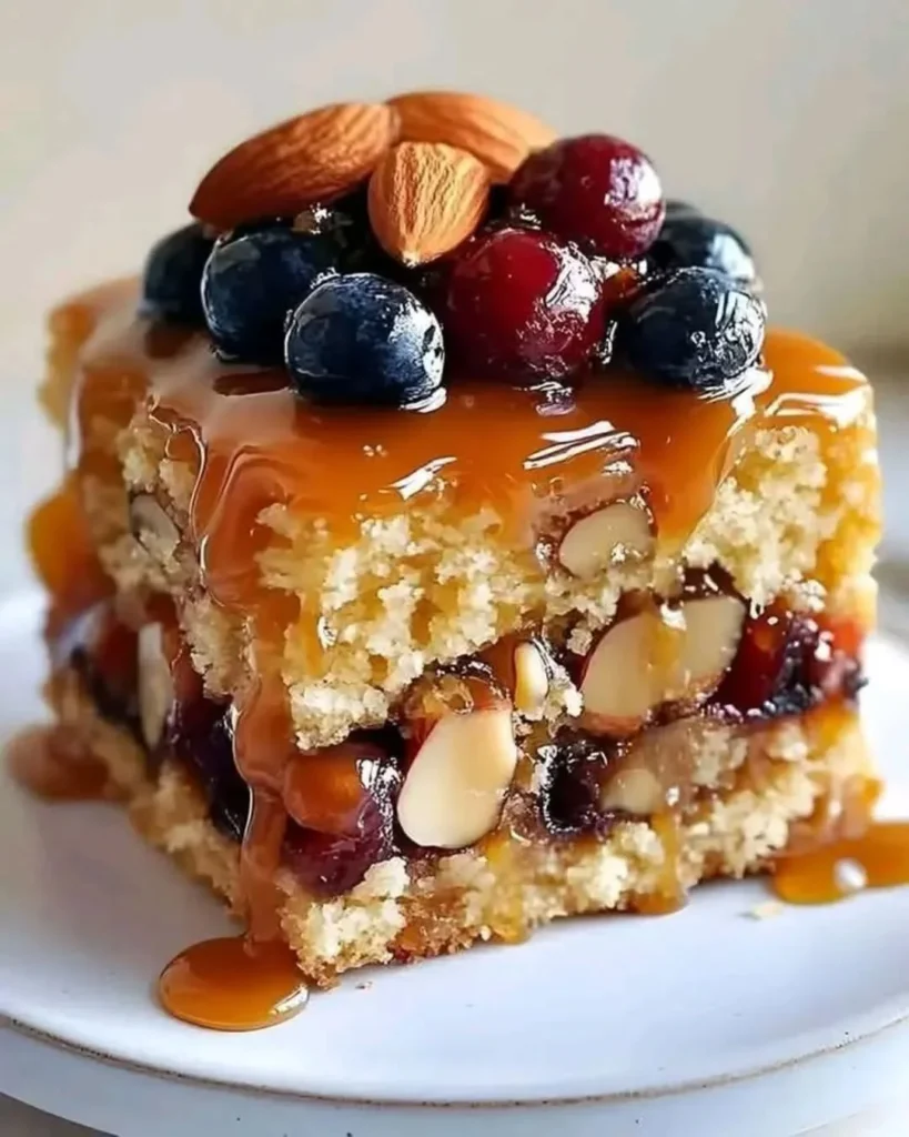 This caramel almond fruit cake is a delicious treat that combines the richness of caramel with the freshness of berries and the crunch of almonds. The cake is light and moist, with a swirl of juicy fruit and nutty flavor. Topped with a golden caramel drizzle and garnished with fresh berries, this cake is perfect for any celebration or just as a special dessert to enjoy.