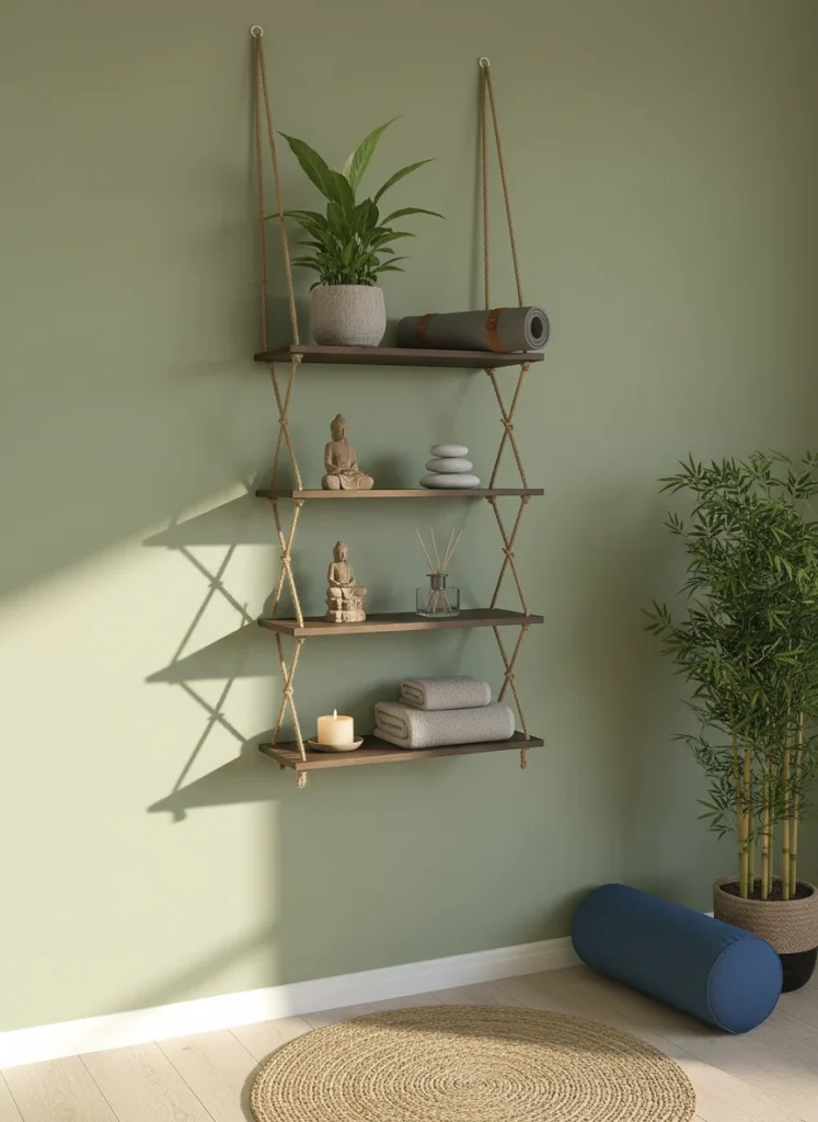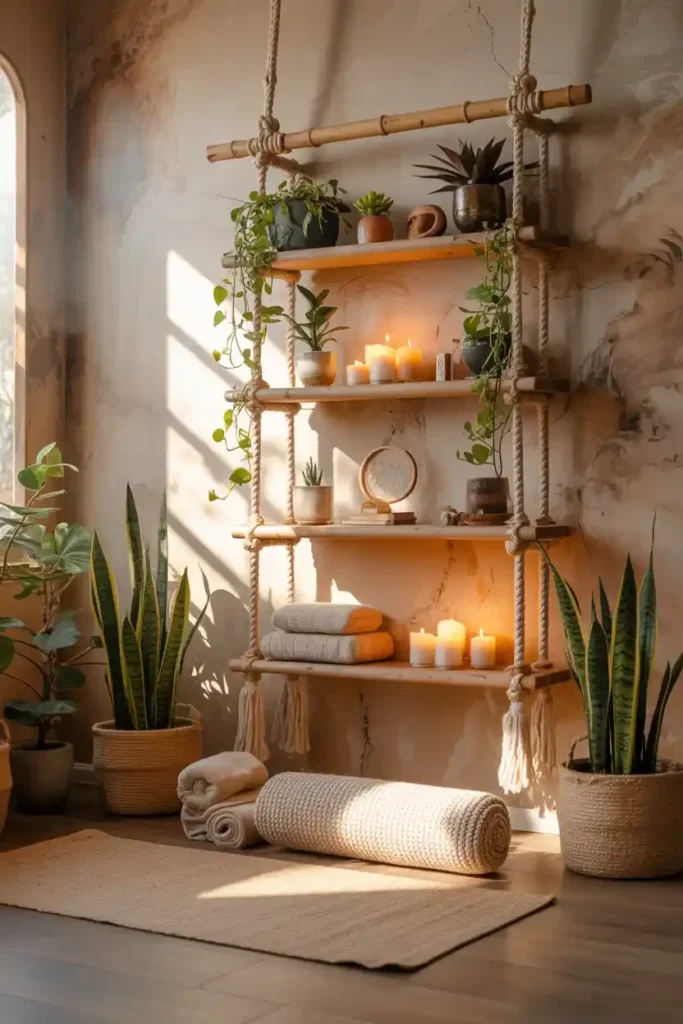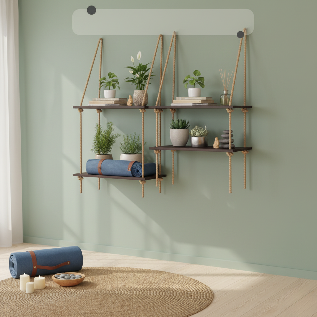 Meet a space saver made for calm practice. Four wooden boards hang on jute ropes that knot into gentle X patterns, creating a ladder of storage without heavy furniture. Place a leafy plant and a rolled mat on the top tier to keep your props within reach.