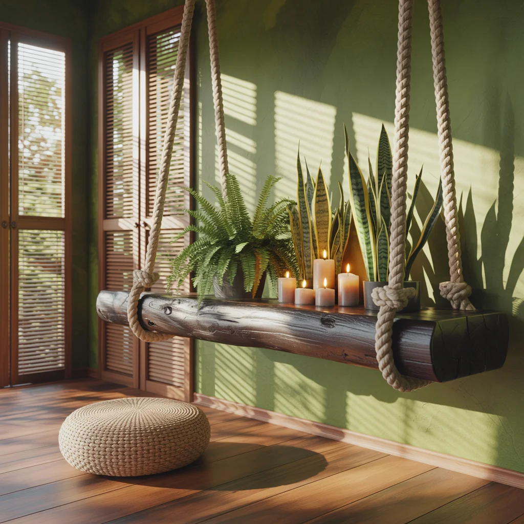 Sun-washed jute ropes cradle a smooth reclaimed log, creating a sculptural hanging shelf that feels grounded and calm. Soft candlelight lines the center while a fern and snake plants anchor the ends, adding breathy green texture to the yoga nook.