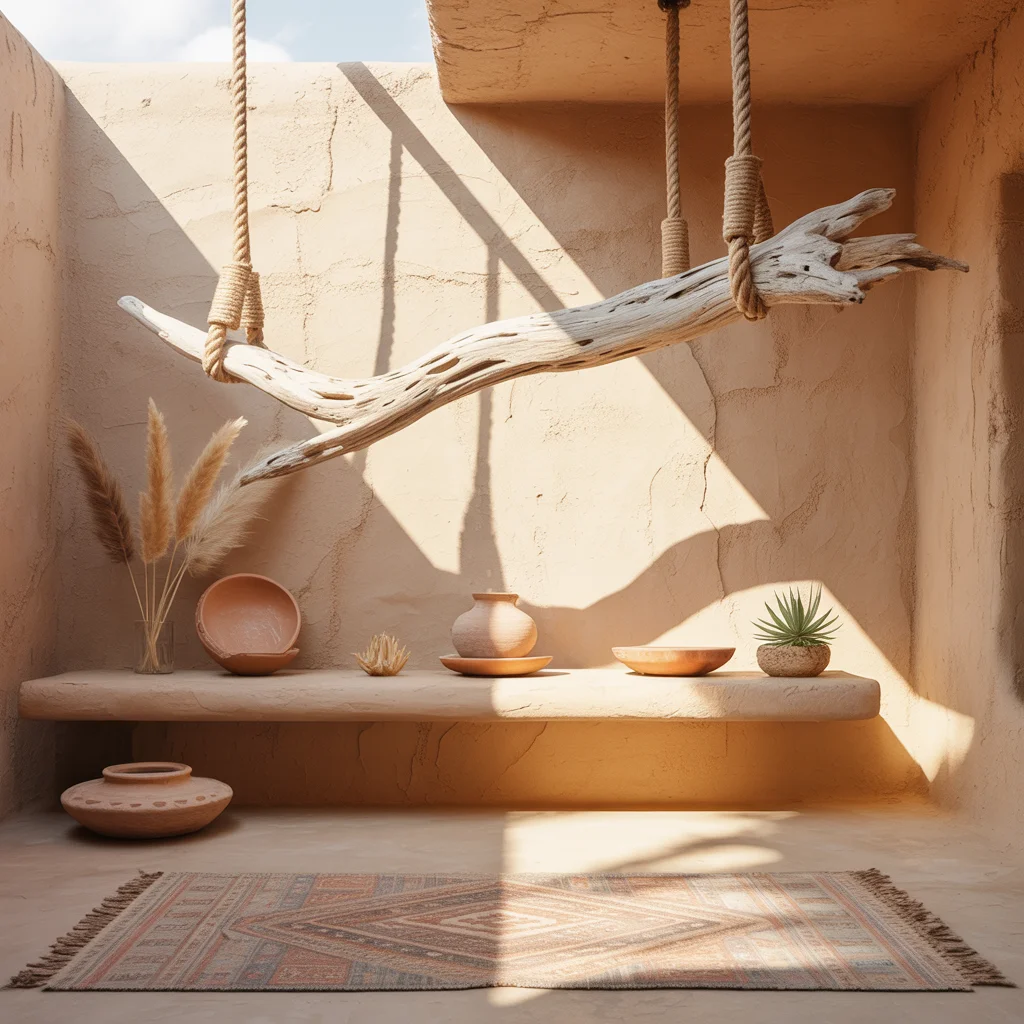 The palette stays earthy,sand walls, terracotta accents, and natural fibers,so the mind settles fast. Build this look with driftwood boards, sturdy rope, and wall anchors, then style light to heavy from top to bottom for calm, balanced energy.