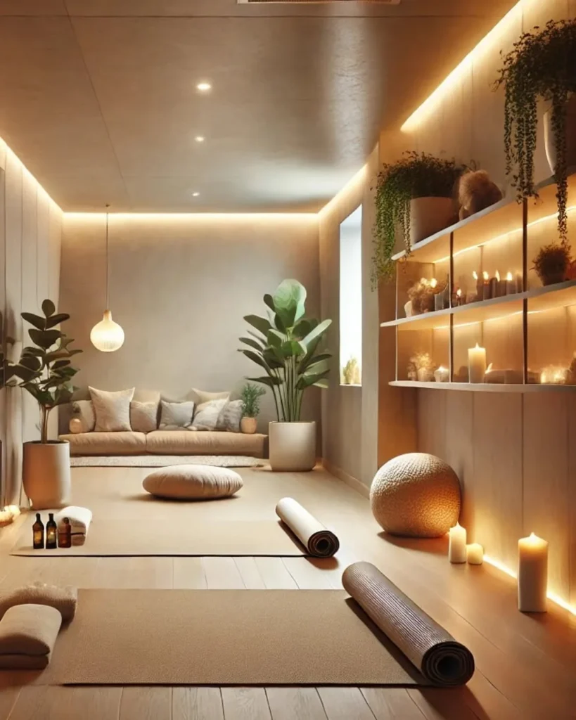 Style with eucalyptus, a few tea lights, and a small plant to invite life and fragrance. Keep the floor clear with a woven rug and meditation cushion. Everything whispers slow living while keeping your yoga room clean and intentional.