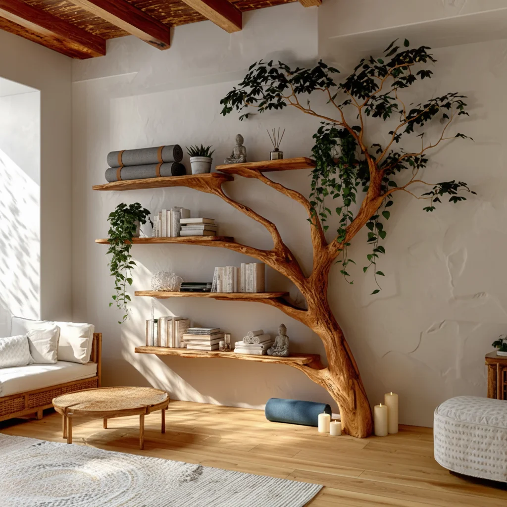 Nature takes center stage with this branching shelf that grows across the wall like a living sculpture. Hand shaped boards nest into the curves of a sanded trunk, creating roomy ledges for yoga mats, folded blankets, and breath work tools.