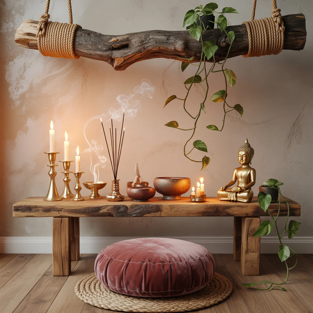 Trailing pothos adds life while brass candleholders and a small Buddha bring quiet ritual energy. You can recreate this with a found branch, two ceiling anchors, and natural rope tied with sturdy knots. Keep the surface simple with a singing bowl, palo santo, and a trio of votives.