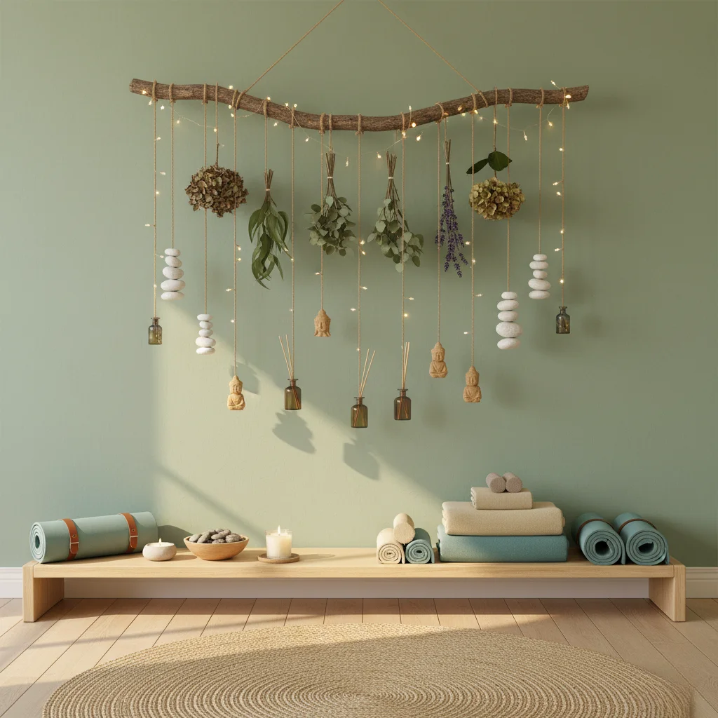 This calming wall feature turns a simple branch and rope into a sensory altar for your yoga room. A found limb anchors twine strands that hold herb bundles, pebble stacks, tiny amber bottles, and carved charms.