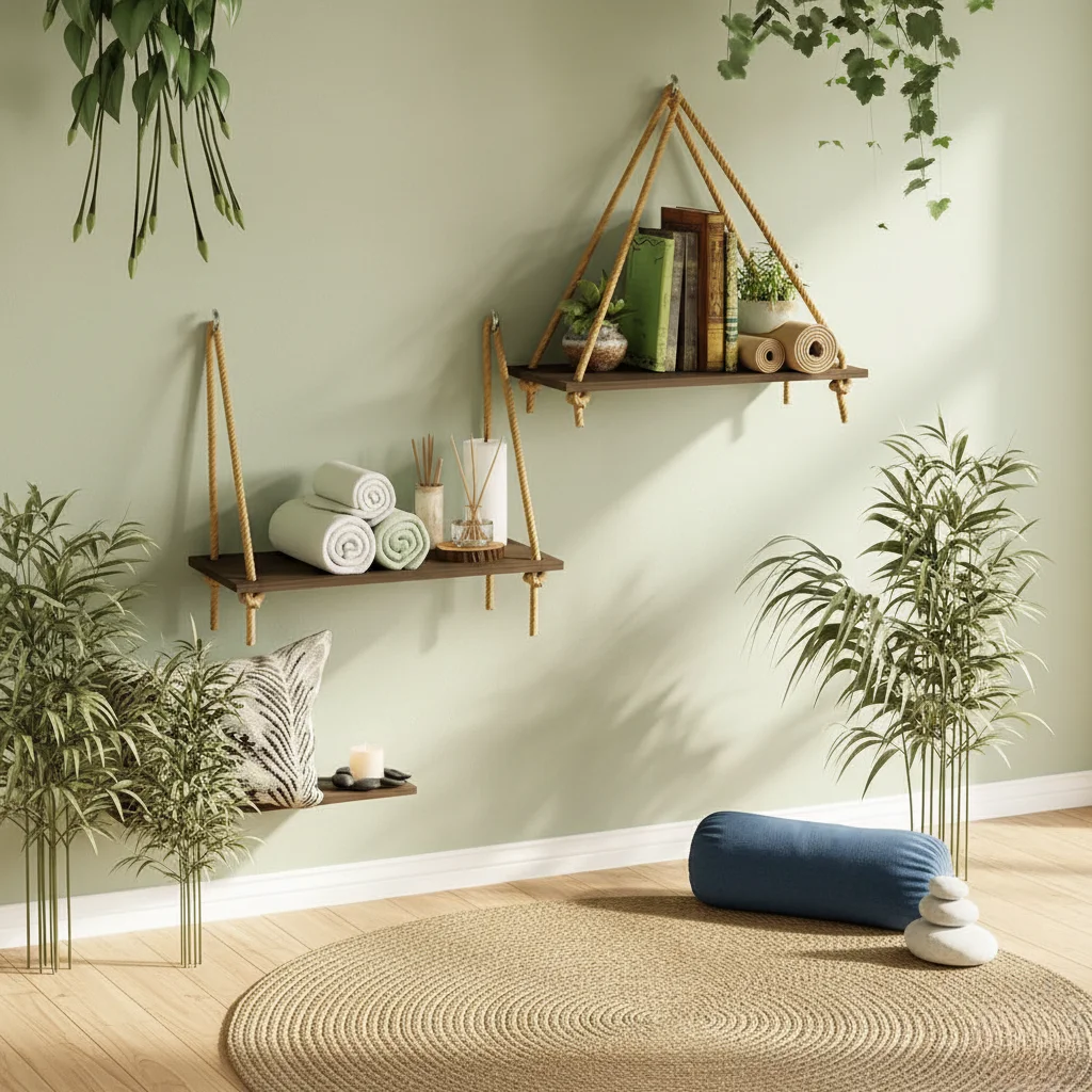 These simple rope shelves bring lighthearted boho charm to a yoga corner. A triangle hanger above and a straight hanger below frame warm wood planks, creating space for mindful essentials.